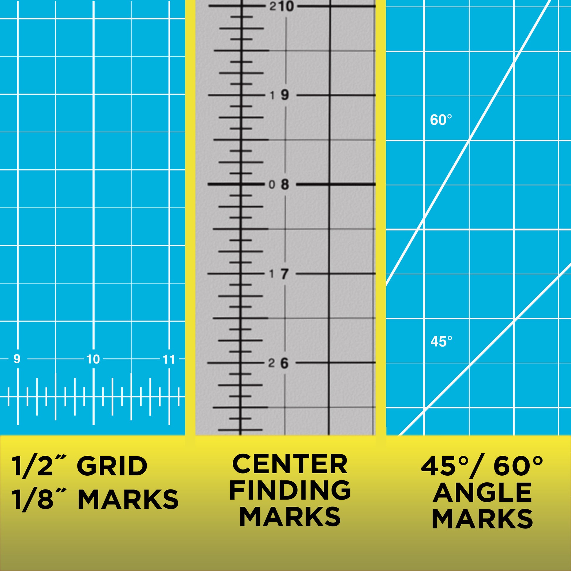 - Quality self-healing and reversible cutting mat, fully numbered and gridded on both sides; 0.5 inch and 0.125 inch lines. Also printed guidelines for 45 and 60 degree angles.